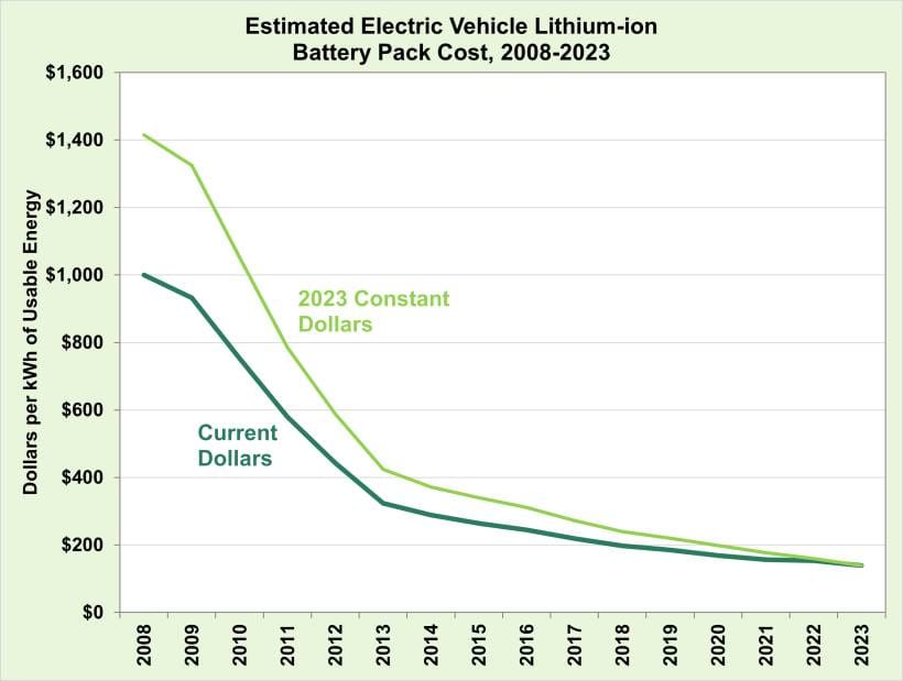 Dramatic Price Reduction: The cost of lithium-ion battery packs for light-duty EVs has plummeted by 90% over the past 15 years, with an average price of $139/kWh in 2023, compared to $1,415/kWh in 2008 (inflation-adjusted).
