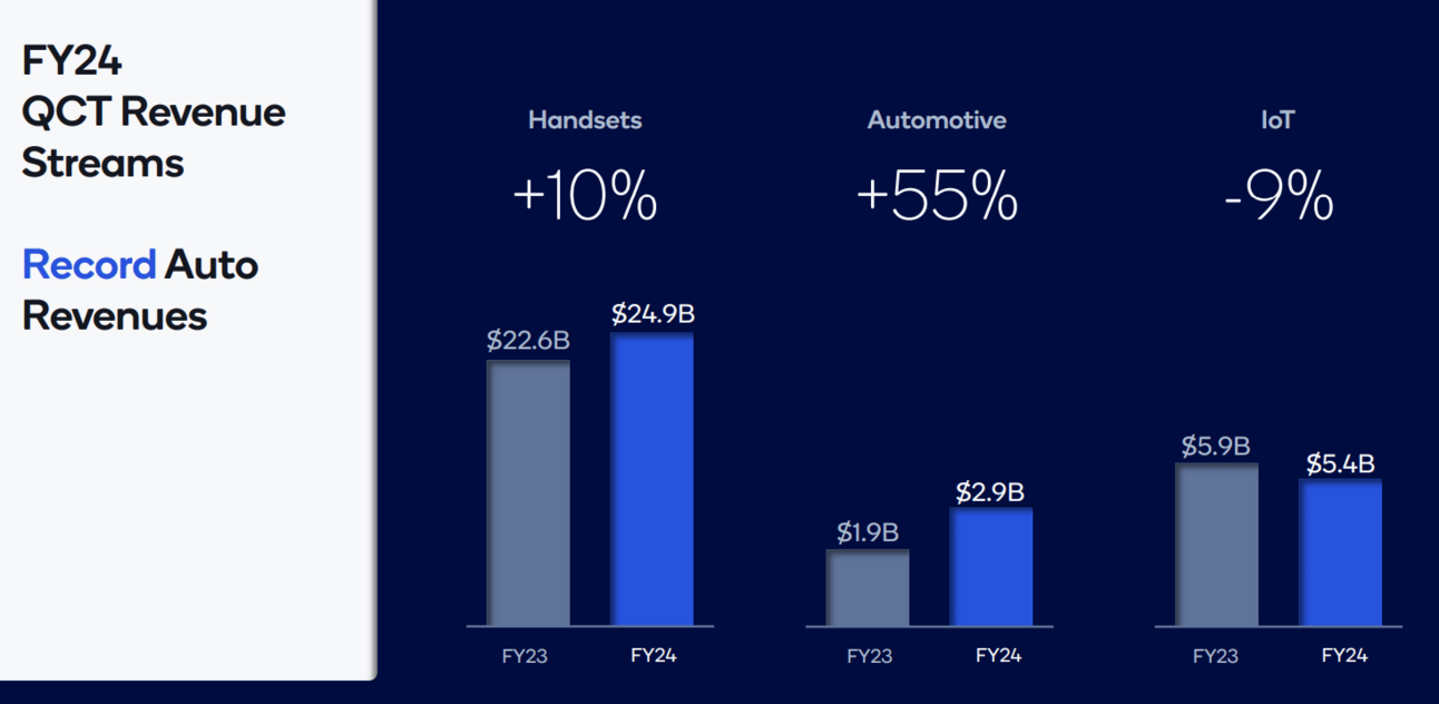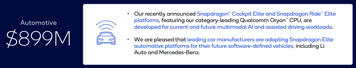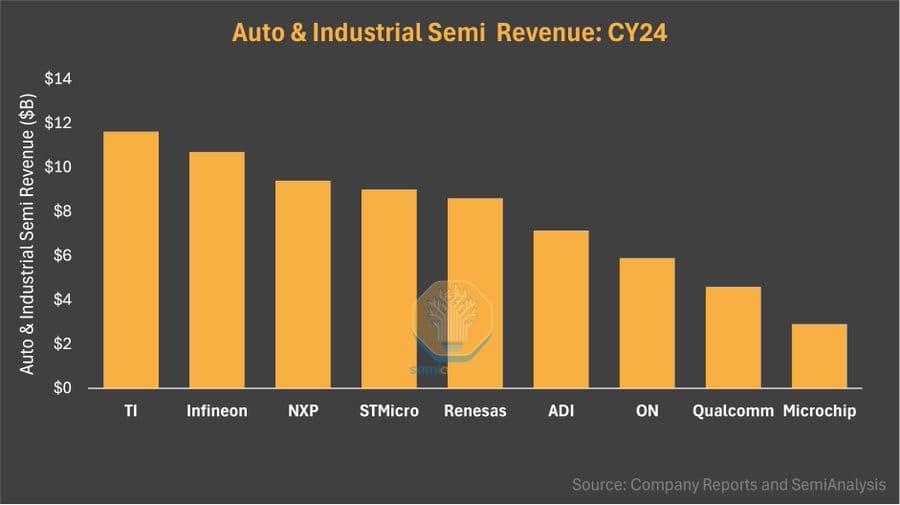 As per a recent post by semianalysis, comparing the revenue of difference semiconductor shops in the Auto/Industrial vertical, Qualcomm is dwarfed by bigger player such as TI/Infineon.