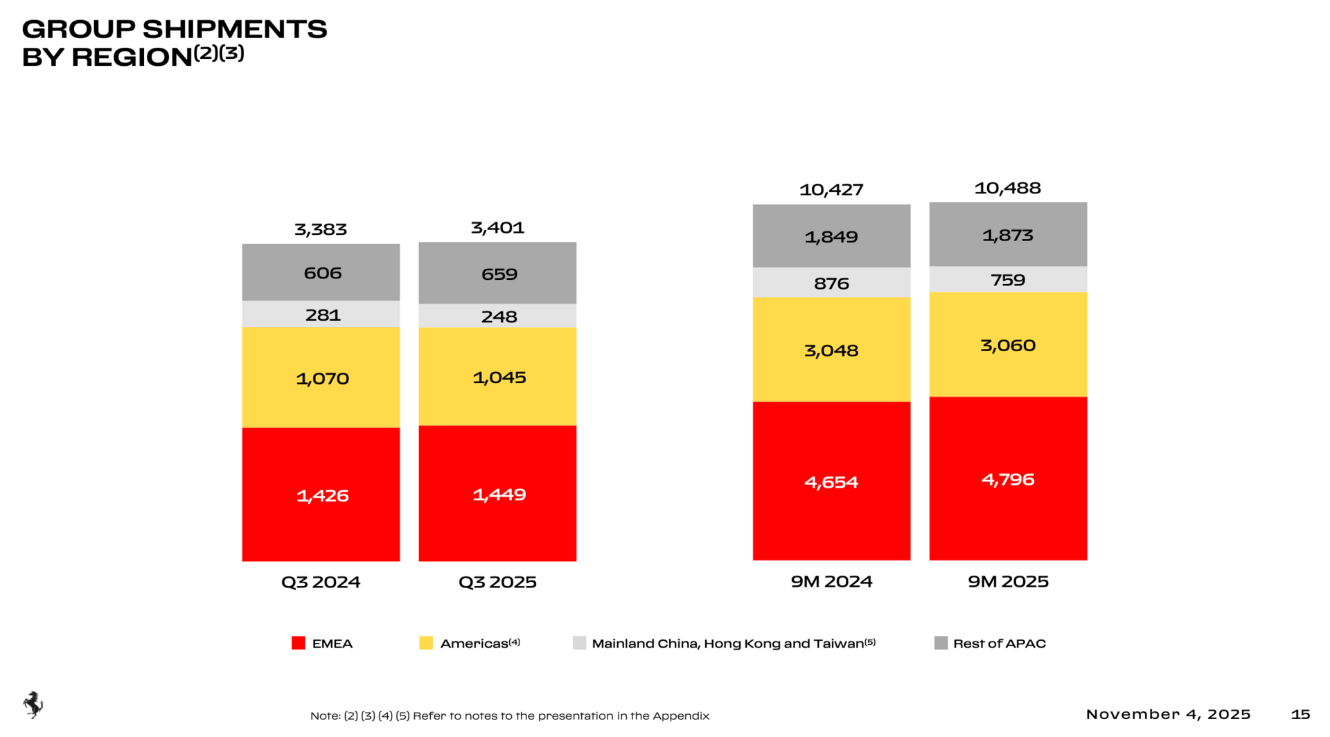 Personalizations remain a key driver, with Q3 penetration at approximately 20%, stronger than the long-term target of 19%. The new tailor-made centers are primarily designed to bring Ferrari closer to clients in markets where personalization is particularly relevant, such as Japan and the Western Coast of the USA.