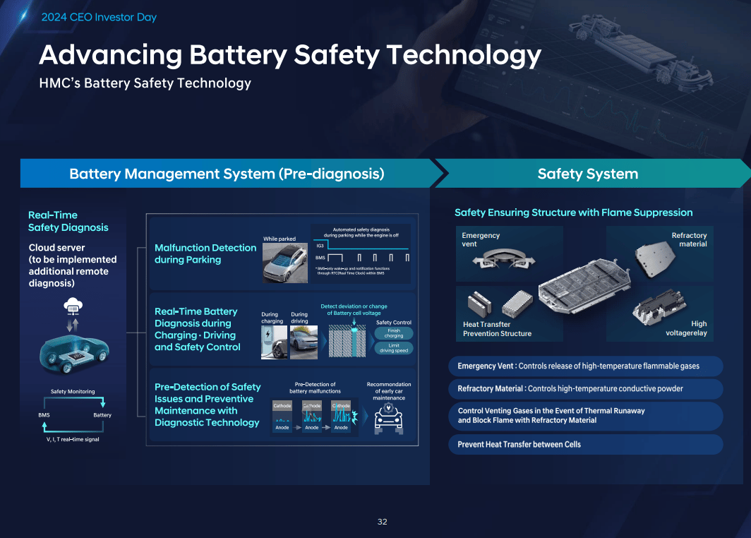 Safety Enhancements: Hyundai is advancing battery safety technologies, including real-time diagnostics and advanced cooling systems, to ensure EV safety and reliability.