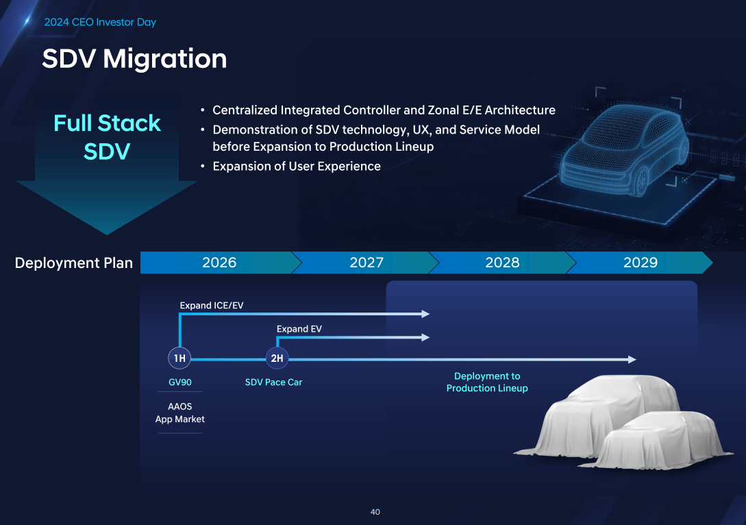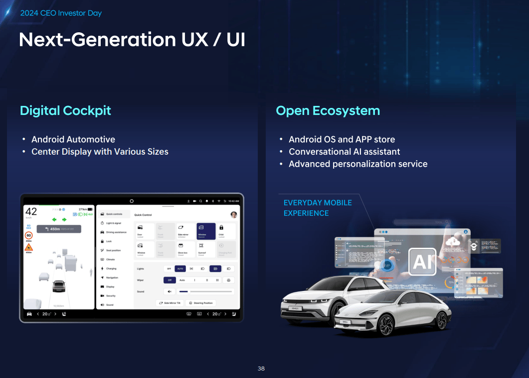 SDV Development: Hyundai is transitioning to software-defined vehicles (SDVs), incorporating AI and digital twin technologies, and developing a next-gen infotainment system based on Android Automotive OS.