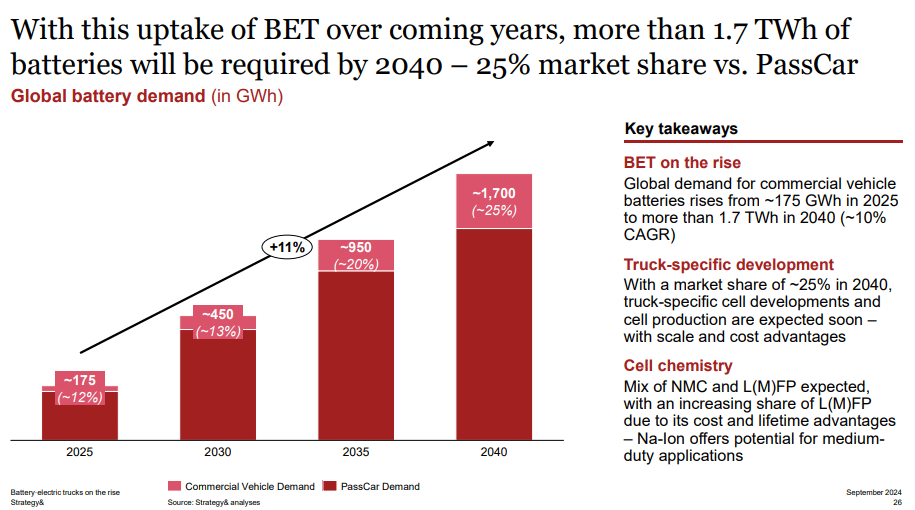 This also opens up for a space in the market for a truck specific battery supplier in the value chain. The needs are quite different and so is the business model compared to passenger cars, so it could be the case that a new player could charge a premium for their heavy vehicle battery systems