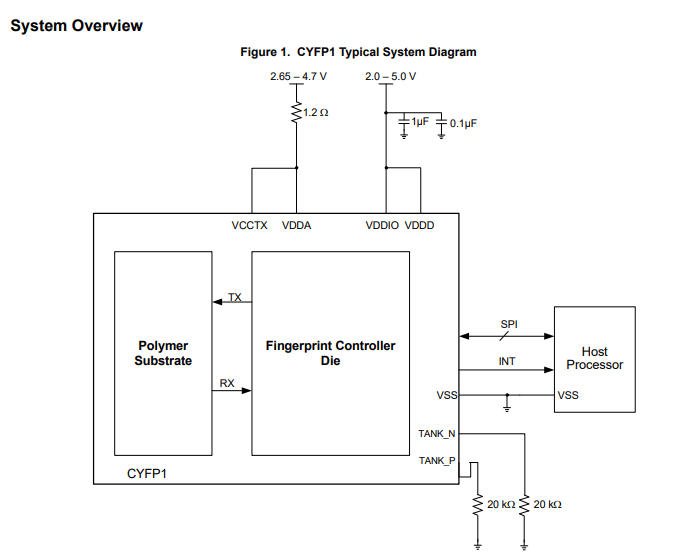 The CYFP1 fingerprint reader works by capturing a fingerprint image through a polymer substrate that contains a grid of row and column electrodes. Here's a step-by-step explanation of how the chip functions: