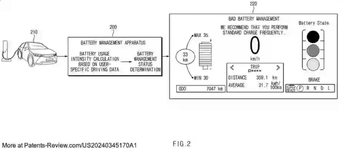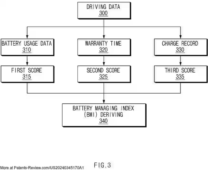 This patent focuses on an apparatus and method for managing electric vehicle batteries. The system calculates a Battery Managing Index (BMI) to reflect the state of battery management by using several scores. The first score is based on battery usage data and output. The second score considers vehicle mileage and the battery's state of health (SOH). A third score is derived from the battery's charging history, including the number of standard and quick charges over different periods. These scores help the system to provide a guide to users about battery management and driving habits, aiming to improve battery longevity and performance.