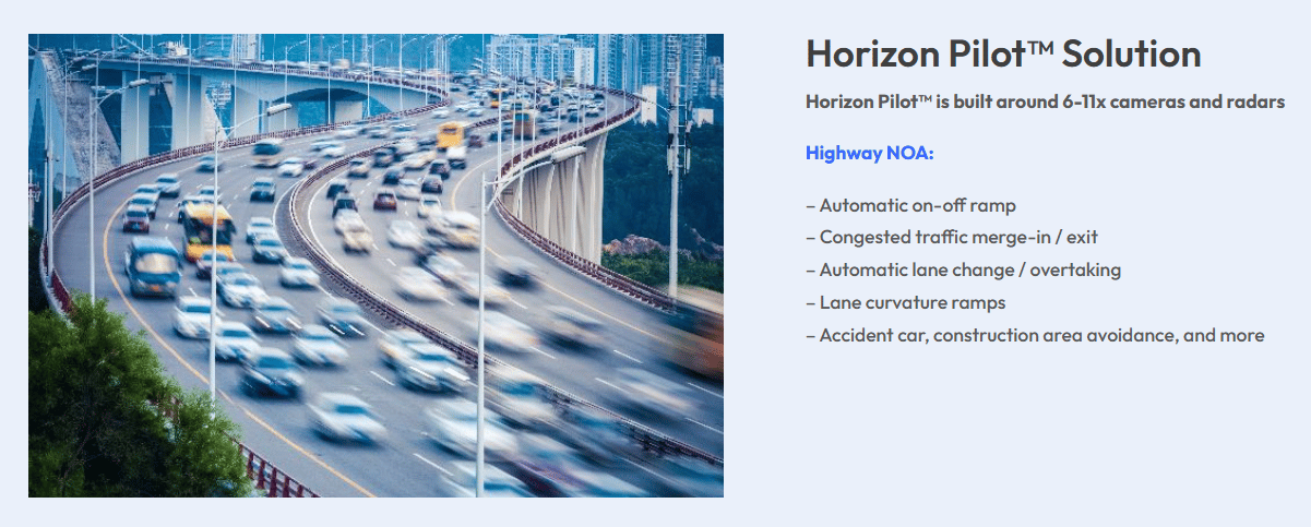 Horizon Pilot is the company's highway navigate-on-autopilot (NOA) solution, categorized as an AD solution, that provides a safe and efficient driving experience. In addition to enhanced active safety features, Horizon Pilot performs more advanced tasks such as automatic ramp on/off, autonomous merge-in and exit during traffic congestion, automated lane changes, highway autopilot, and more. These functions improve the driving and riding experience for end users, especially in long-distance commutes. At the same time, Horizon Pilot offers advanced parking functions such as auto parking assist (APA) and automated valet parking assist (VPA). The company currently embeds Journey 3 or Journey 5 processing hardware in Horizon Pilot.